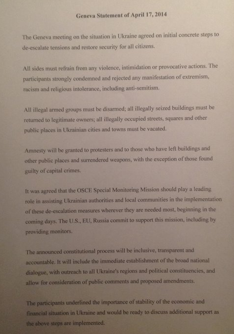 El secretario de Estado de EE.UU., John Kerry, que ofreció su visión de la solución para Ucrania después del diplomático ruso, le agradeció a Lavrov su capacidad de trabajar y mantener el diálogo de una manera constructiva, igual que al representante de Ucrania, Andréi Deshitsa. Todas las partes implicadas en el conflicto en Ucrania deben renunciar a la violencia, el extremismo y las manifestaciones nacionalistas, agregó Kerry.